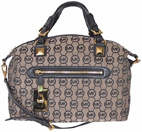 !±8± Michael Kors Monogram Signature CALISTA Large Satchel Bag Shoulder Tote Handbag - Beige / Black